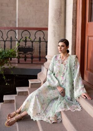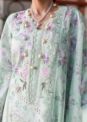 Additional Description:Â From bud to bloom. Prints are a way of welcoming summer with all its glory. This is a printed mint canvas with carnations, one of our favourite flower, in lilacs pinks and sages. All three panels of the shirt are adorned with cutwork borders in ivory in a diagonal composition. The daman is finished with an organza embroidered border. The neckline is flower bunch kisses here and there. A soft, breezy, cotton net printed duppatta with pallus finished in scallop floral embroidery. Femininity brought to life.