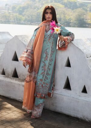 A summer turquoise blue ensemble presents a picturesque vision of rich tradition and sophistication, enhanced by meticulously executed embroidery on lawn fabric. Alluring floral motifs on the shirt, combined with intricate neck patch embroidery, lend an ethereal quality. A rust orange embroidered dupatta, featuring a color-block printed organza border, complements the ensemble. This modern and dazzling silhouette is completed by coordinating turquoise blue shalwar with embroidered patch details.