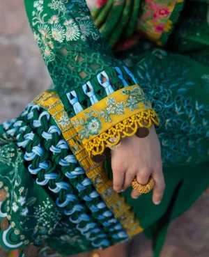 Hèlene reflects the lushness of a green thicket, with gold tilla and sequins adorning a three-paneled shirt, set against satin box hem borders that frame the shikargah-themed contrasts, all paired with a silk printed dupatta.