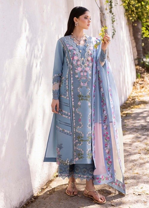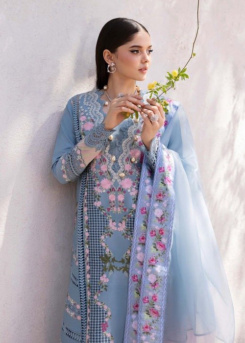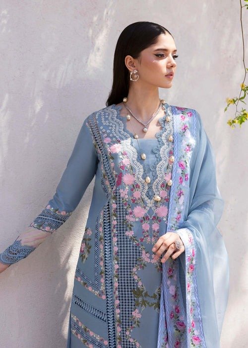 Additional Description: There’s something so beautiful about a classic blue. Our second reveal is lively and dramatic. We have a cutwork front centre panel caressed with delicate floral vines in shades of lavender and mauve. The side panels are composed with delicate floral vines. The hem corners are finished in an uneven manner with embroidered maple leaves and orchids detailed to perfection! The outfit is paired with a three tone duppatta PRE-STITCHED in shades of lilac, periwinkle and mint finished with a silk printed border. This ensemble is a perfect symphony of statement and beauty!